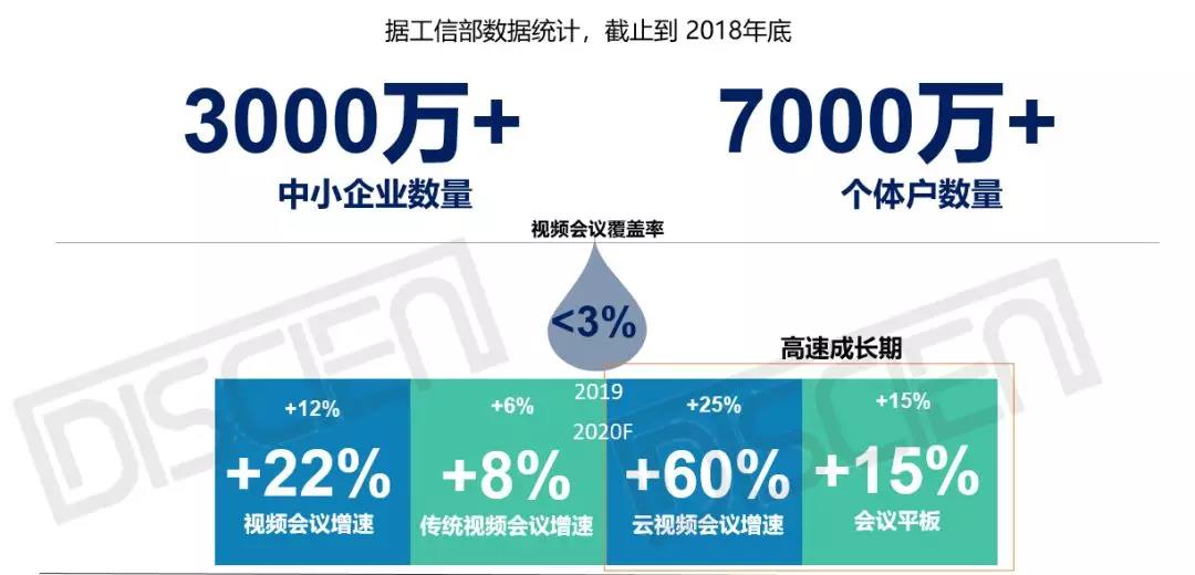 從市場空間上來看,據(jù)工信部數(shù)據(jù)統(tǒng)計(jì),截止2018年,我國的中小企業(yè)的數(shù)量是在3000萬家以上,個體戶的企業(yè)數(shù)量在7000萬以上,整體來看視頻會議的覆蓋率還是非常低的,在3%以內(nèi),整個市場的空間潛力還是非常巨大的。